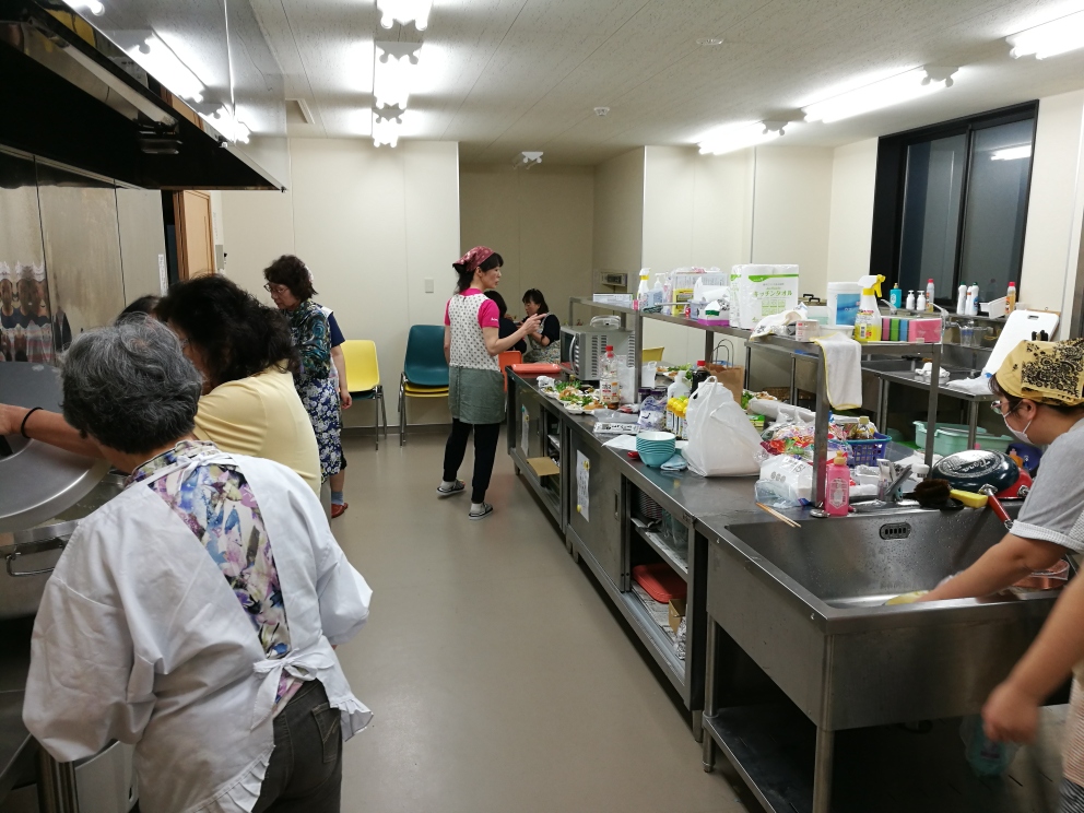厨房の中ではこのように学生のボランティアの方々や有志の方々がお手伝いをしてくれています。食材は基本的に寄付をいただいたものを中心に賄っています。今回はお手伝いの人も多く、かなり充実したメニューになりました。
