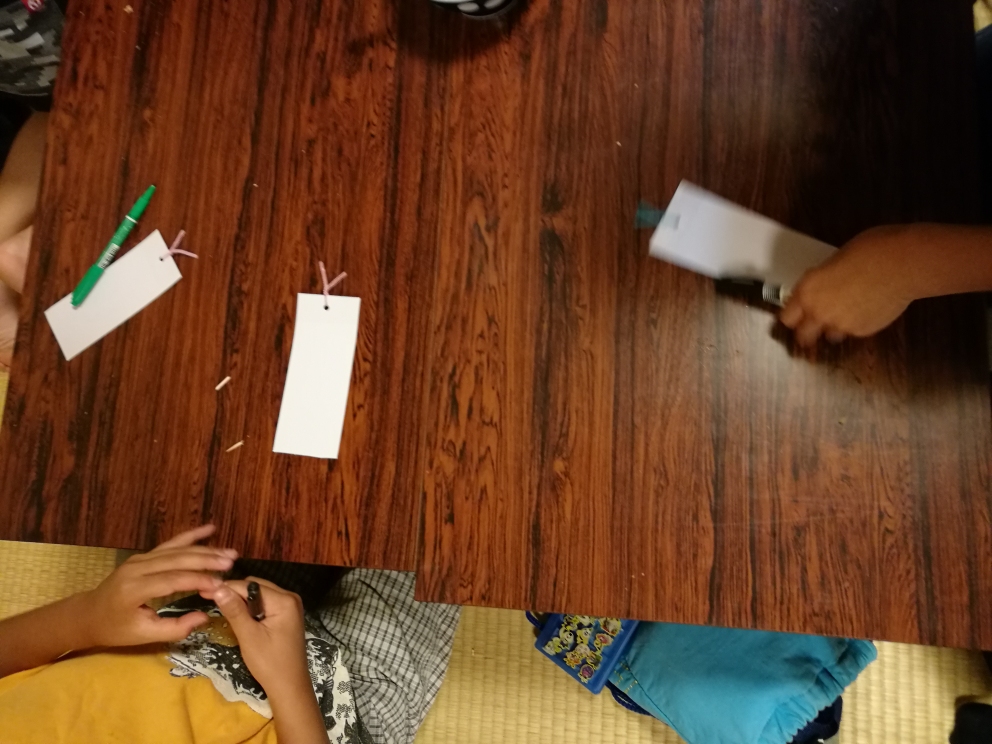食事の後、7月に神社で七夕の竹飾りを行いますのでその短冊を書いてもらいました。食事の後にこういった活動も行っています。