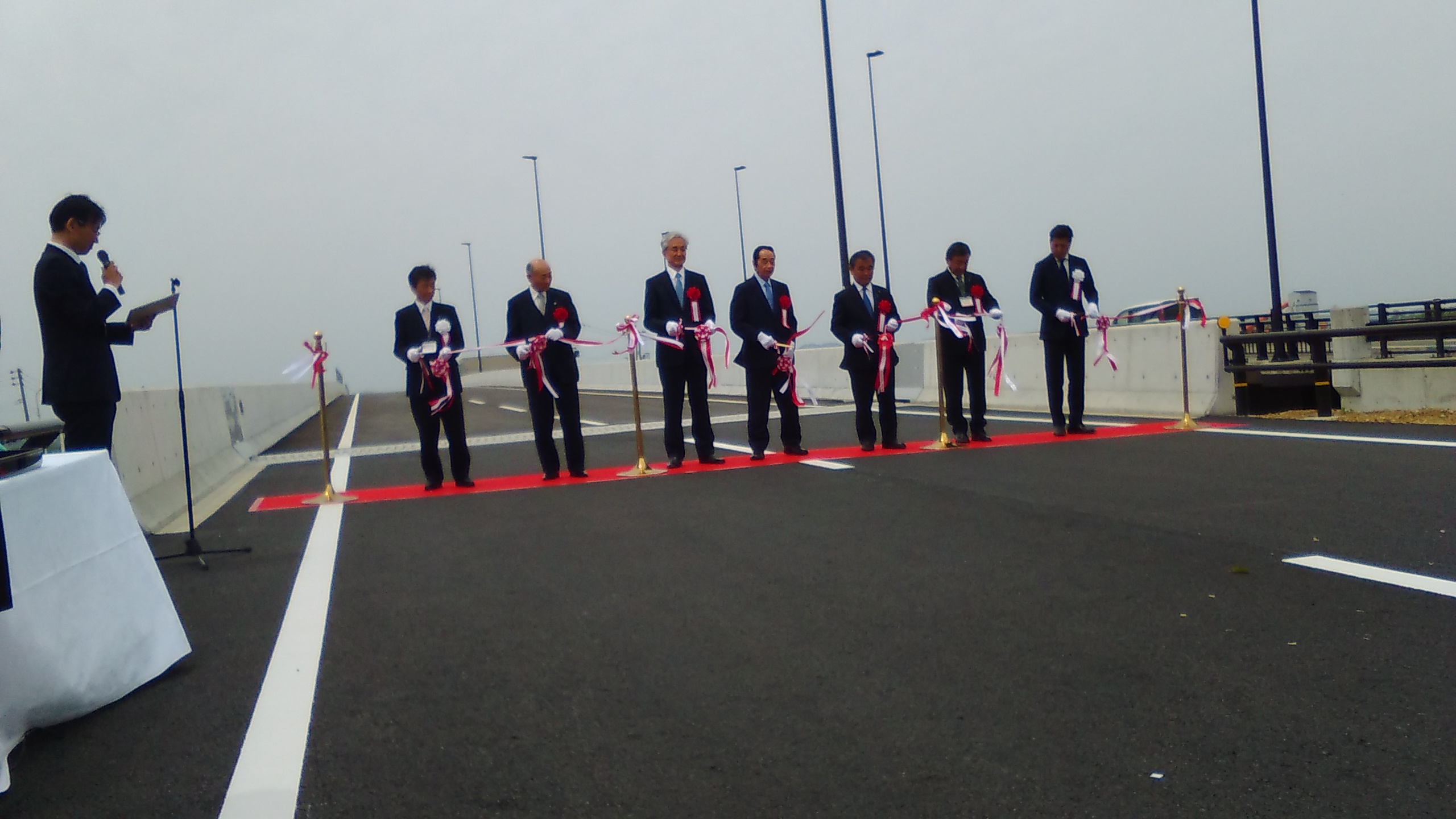 式典の後は写真の通りテープカットと地元保育園児との記念撮影が行われました。午後2時より開通になるそうです。