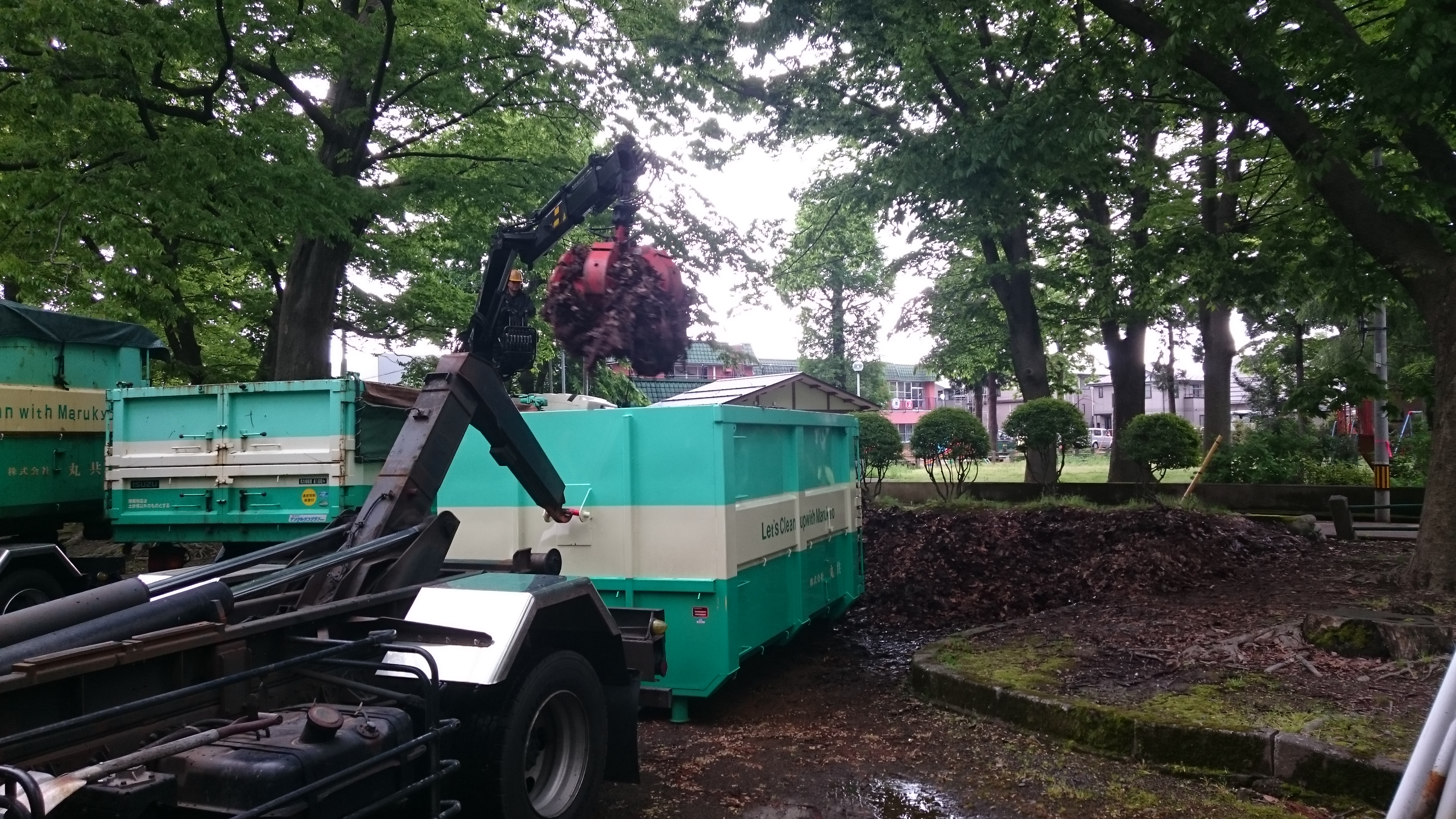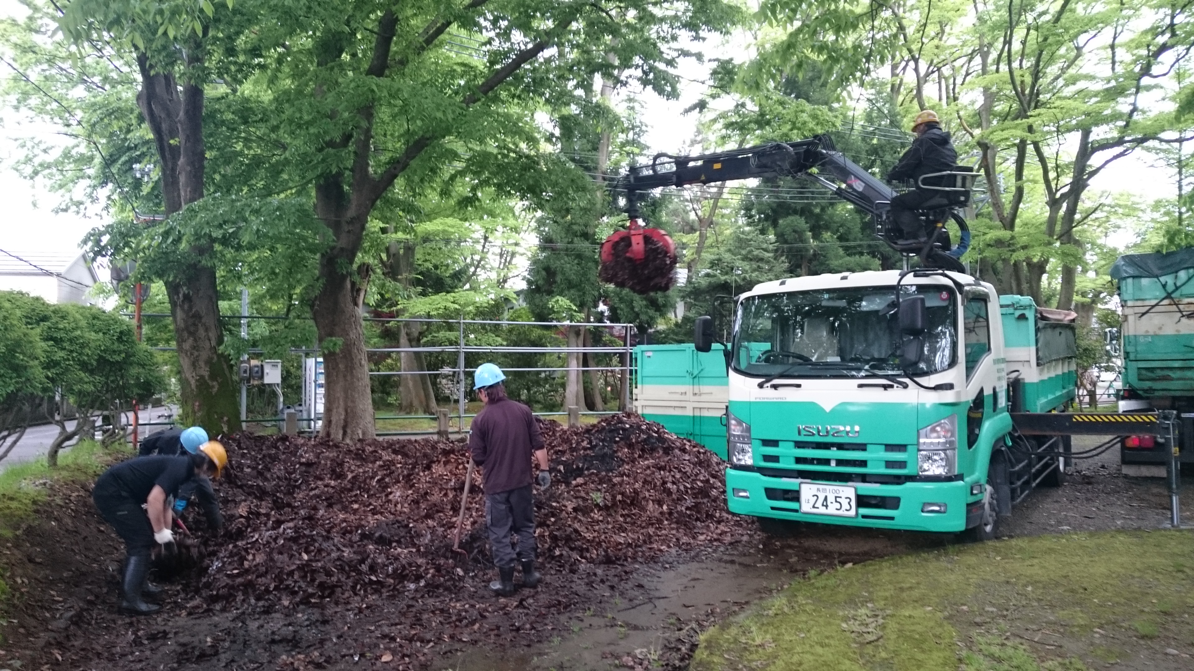 さて、前置きが長くなりましたが、昨年の落ち葉を境内の隅に固めておりましたが、長岡市公園緑地課に依頼をして落ち葉の回収をしていただきました。