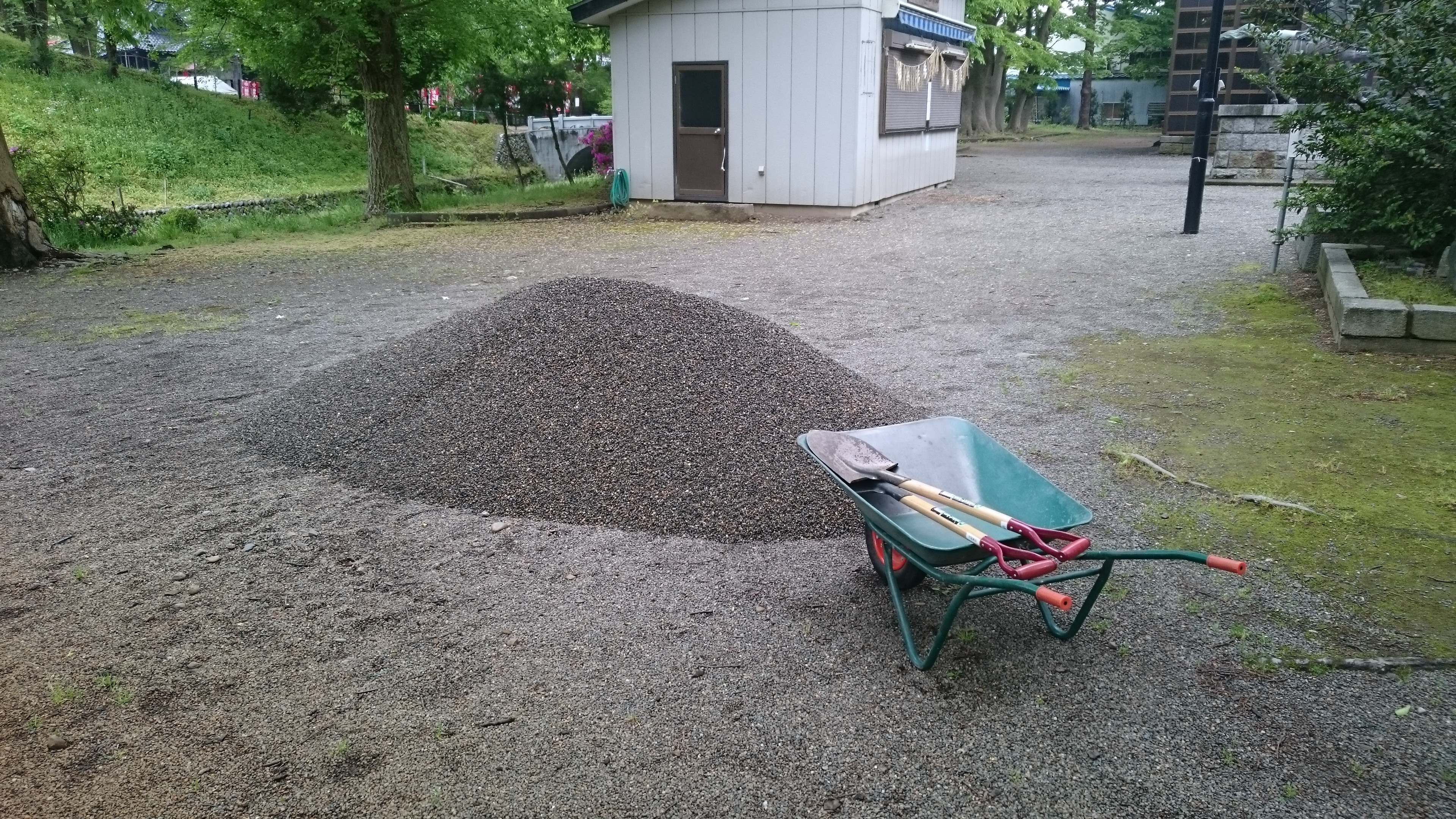雪の重みでかなり圧縮されていますが、トラック2台でも入りきらない量です。雨の中、作業に当たられた皆様、有難うございました。ちなみに、落ち葉のなくなった所には、例祭流鏑馬での臨時の馬小屋を設置予定です。(吉)