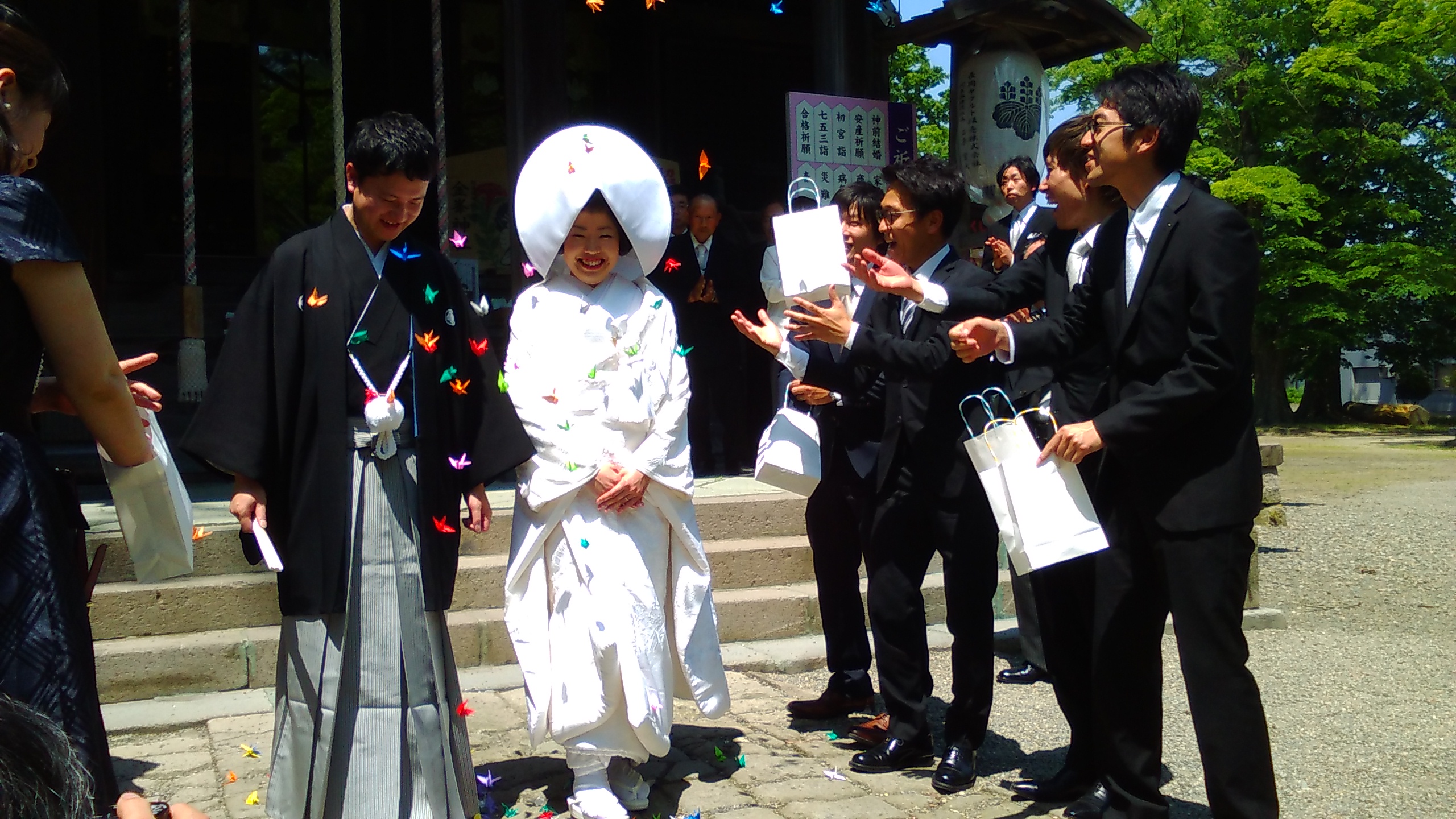 式の最後には折り鶴シャワーで新郎新婦を祝福されていたのがとても印象的でした。