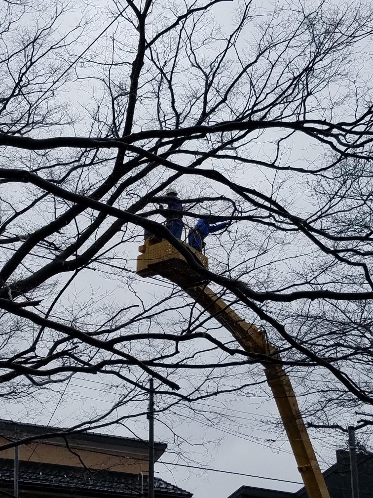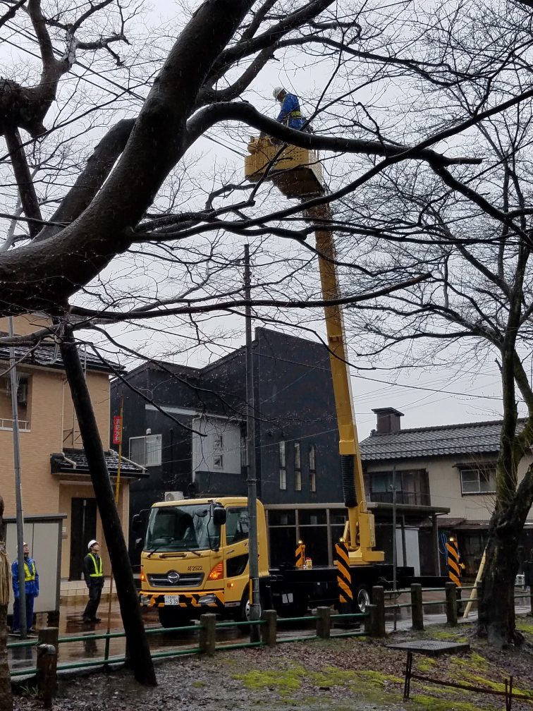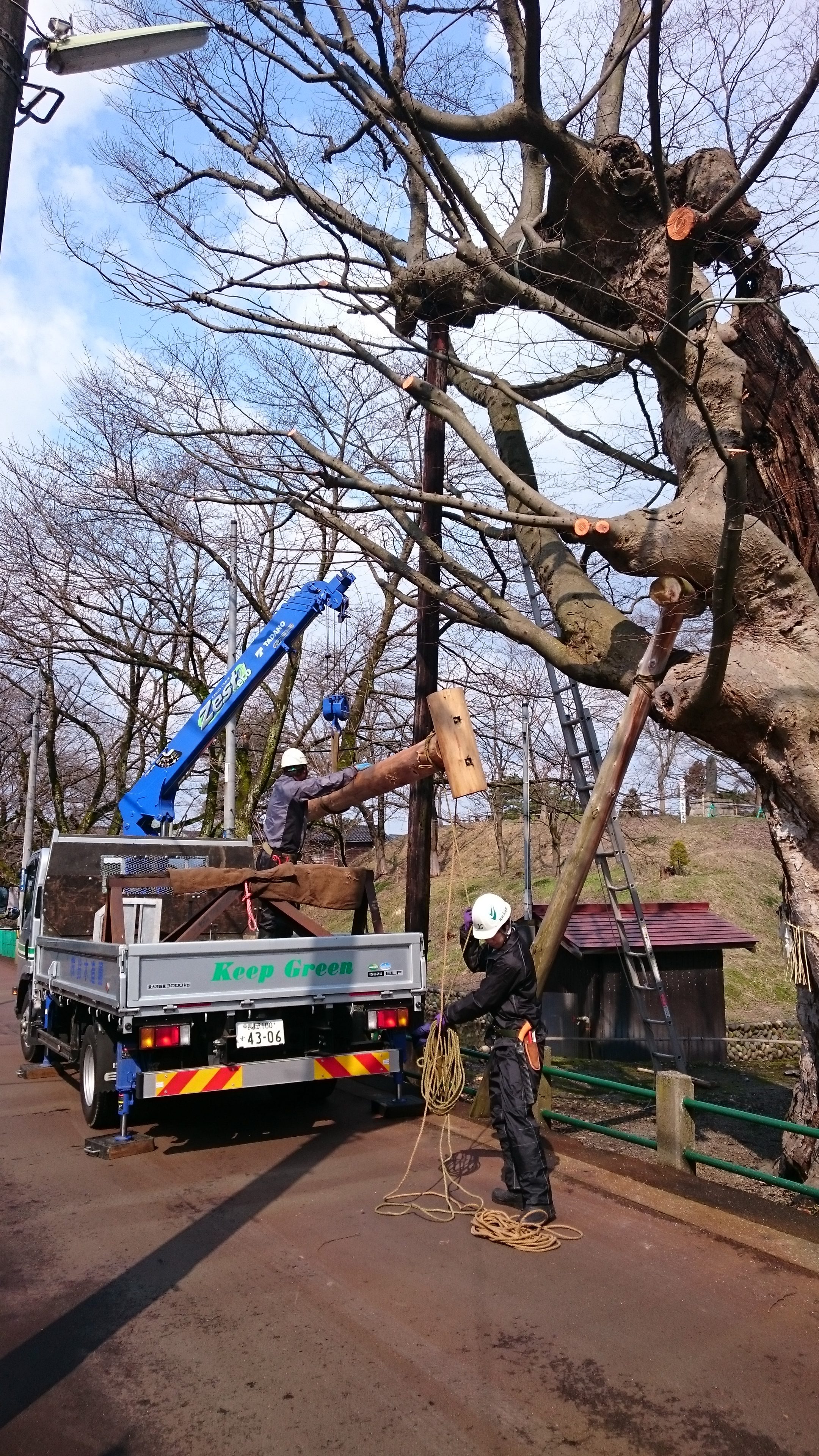 本日は、大欅の太い枝を支える支柱を取り付ける作業を中心に進められております。