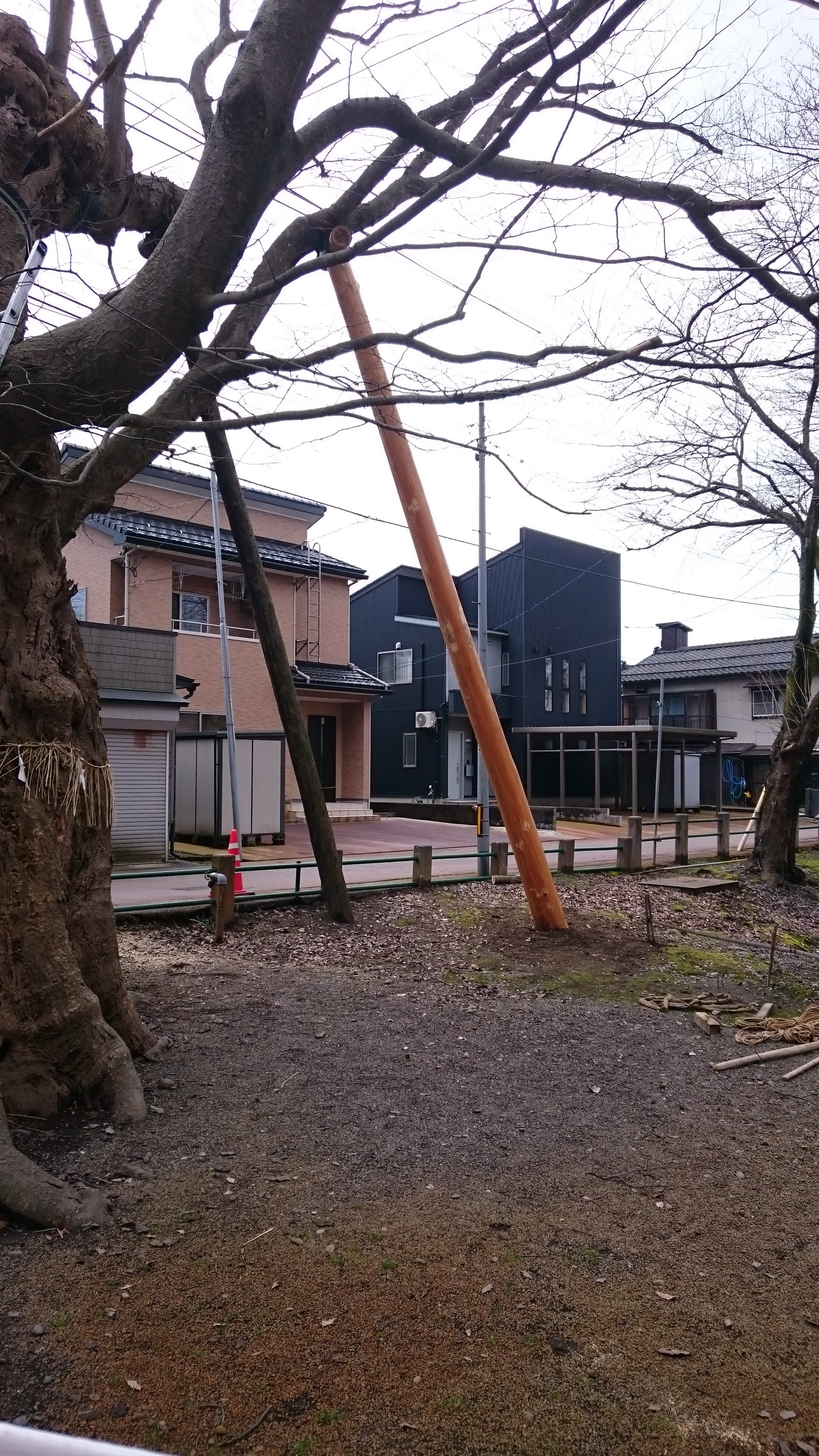 支柱は一本杉を使用します。皮を剥ぎ、防虫加工しているためかなりの重量がありますが、20年はしっかりと支えられるとのこと。事故のないように慎重に作業は進みます。