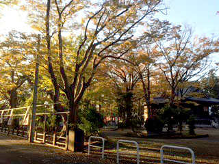 夕暮れの境内です。そろそろ紅葉も終盤でしょうか。落ち葉を一か所に集めていますが、いよいよ山のようになってきました。(桃)