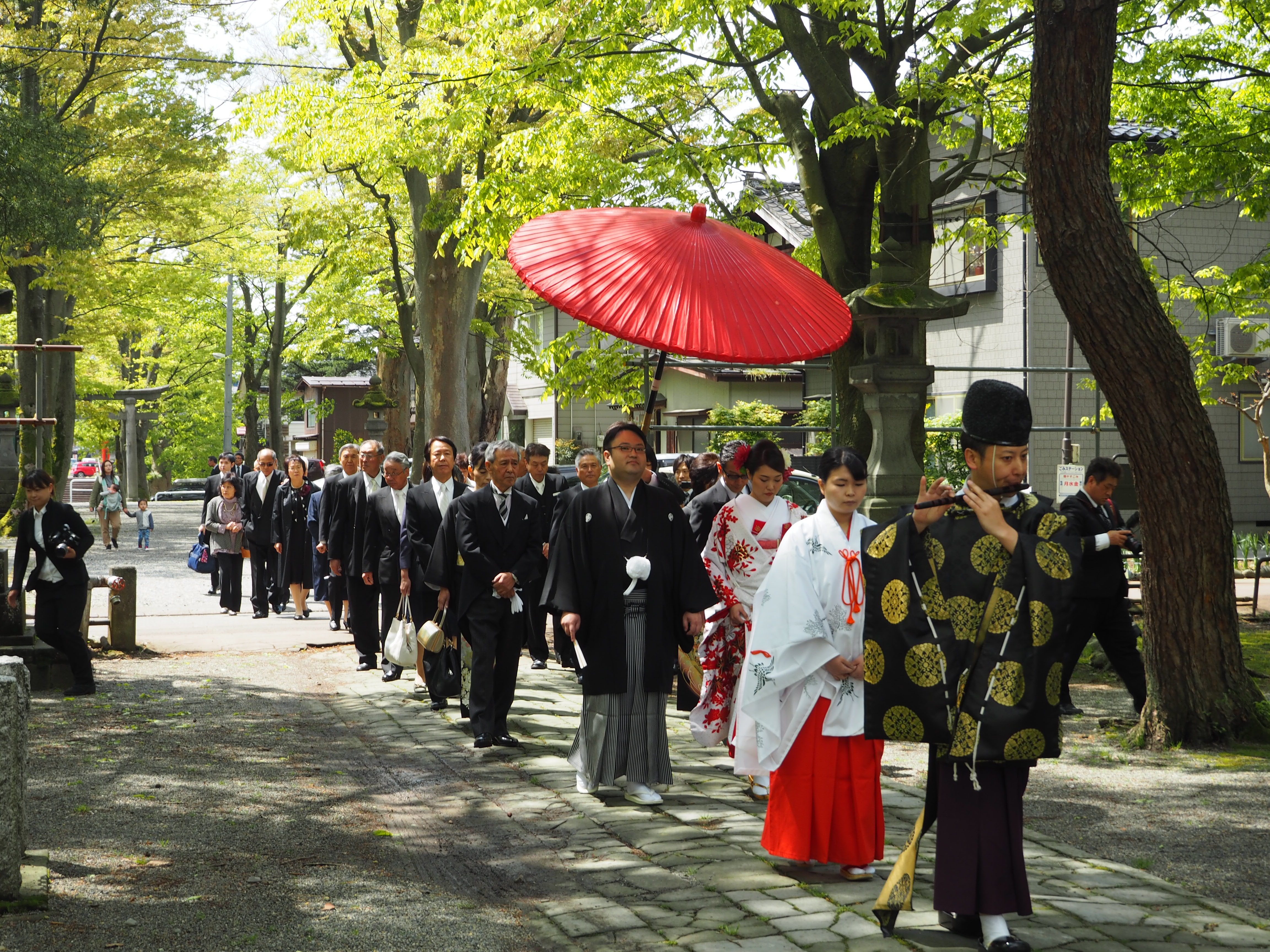 境内が新緑に包まれ、参道に立ちそびえる木々から日が差し込む吉き日に神社にて、神前結婚式が執り行われました。