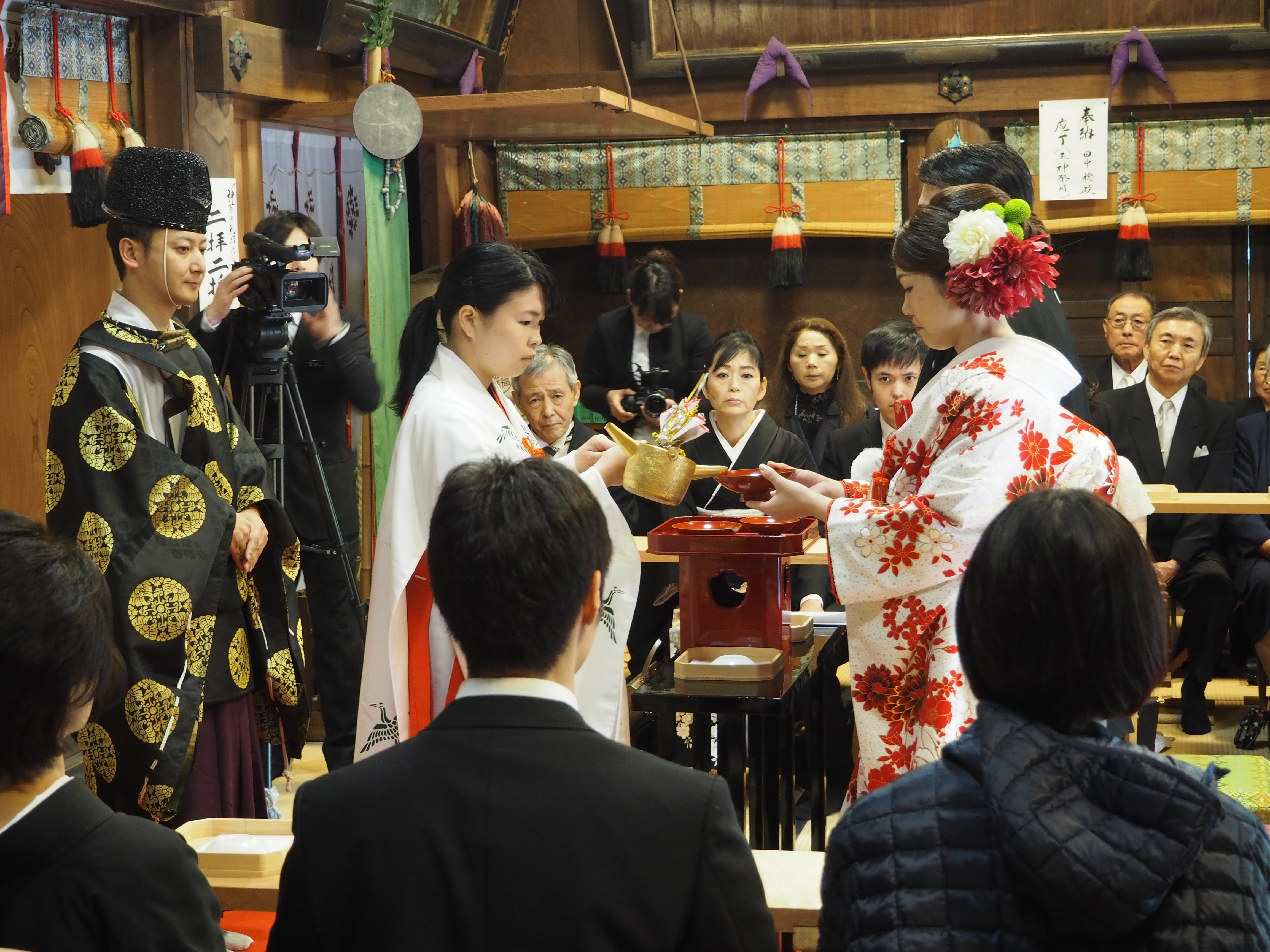 神前にて、三献の儀が執り行われ「新郎新婦」様は盃を、くみ交わします。