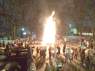 神事の後点火、ふるまいの甘酒屋するめが配られると写真のように火の回りに大勢の人たちが集まってきました。