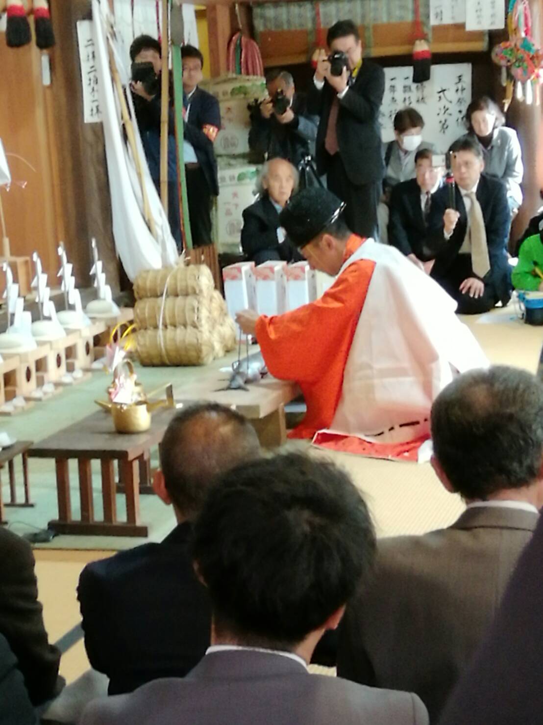 ご来賓の皆様や一般のご参拝者が見守る中、古代祭祀を思わせる神事が厳かに行われました。また、新町小学校の3年生約60名が総合学習で参列していただき、1時間半近くにも及ぶ長い神事にも関わらず、静かに集中して、時折メモを取りながら見学をしてくれました。