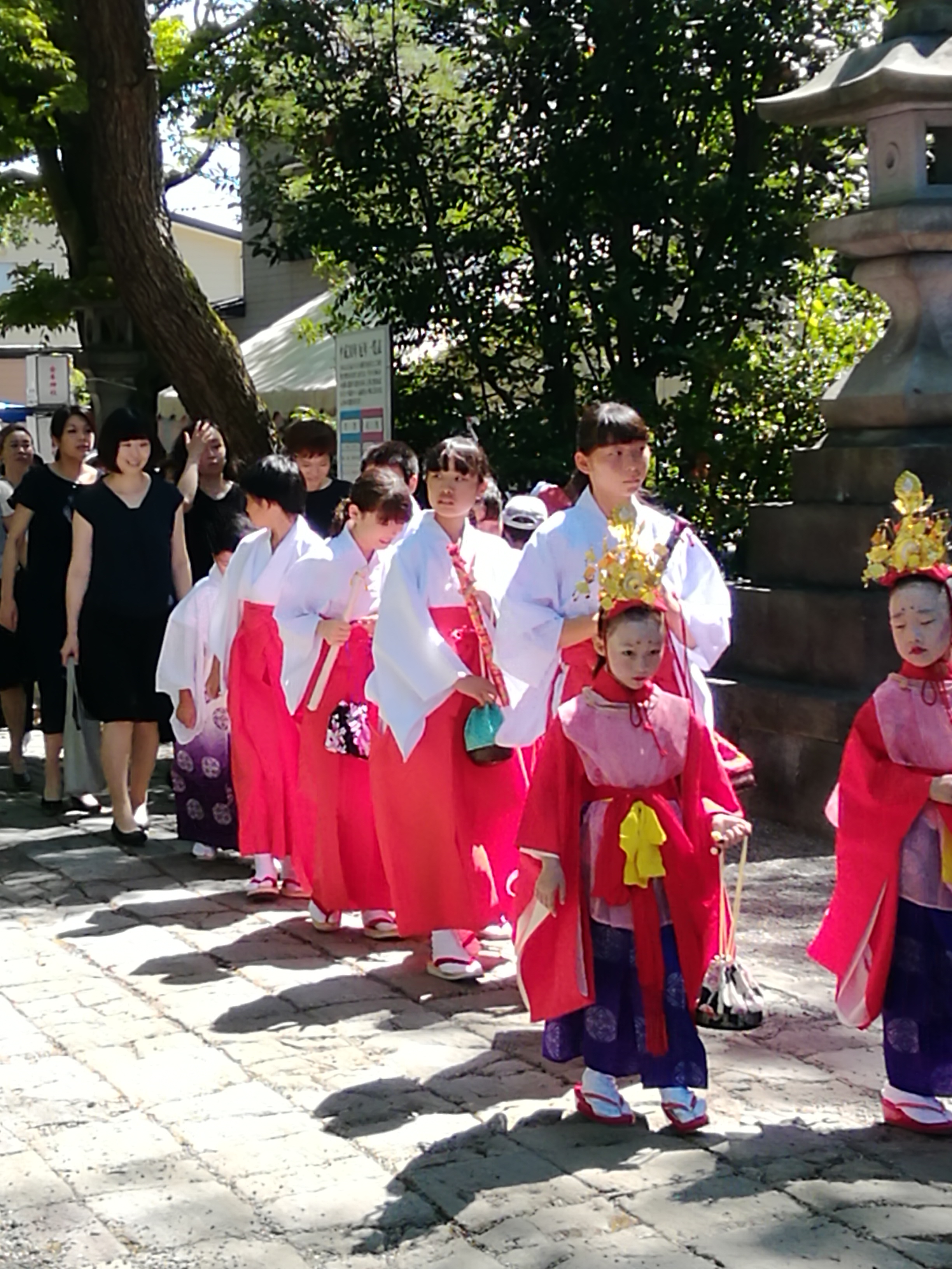 拝殿前でお祓い、巡行の安全を祈願し、暑さの厳しい中元気な掛け声とともに各町内をお神輿が回りました。町内によって歩く距離が違いますが、長いところは1時間以上練り歩いたようです。子どもたちの中には稚児舞に参加してくれた子もいましたが、全く疲れなど感じさせない様子でした。
