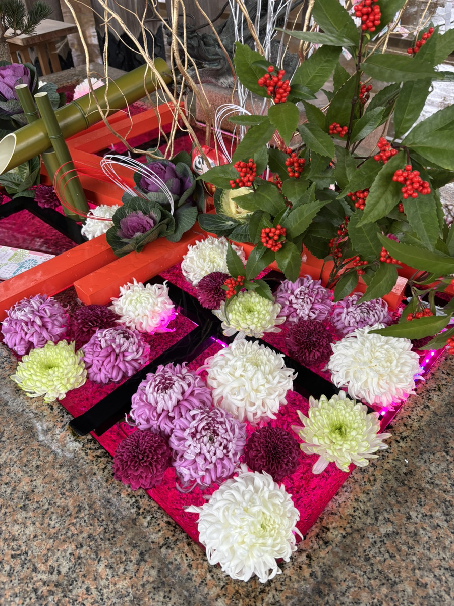 新年を祝し、花手水をライトアップいたしました。午年に掛けまして『きっとうまくいく』 と題しました。参道も光の装飾を施し、皆様をお迎えする準備を整えております。幻想的な雰囲気の中、一年の感謝と新年の誓いをお捧げください。