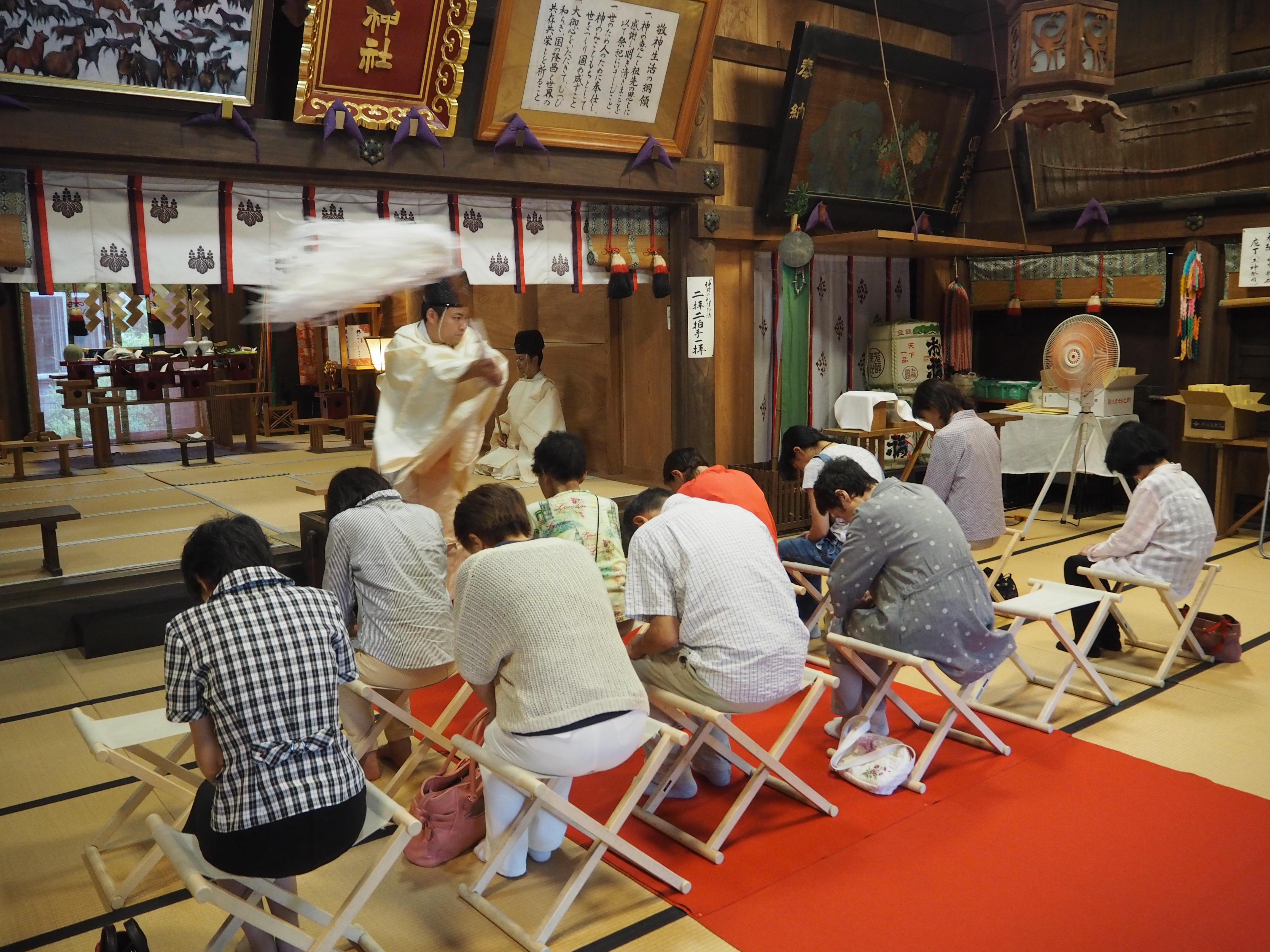 当日は拝殿にて修祓(お祓い)、大祓詞奏上などの後、切り麻(奉書と麻を細かく切ったもの)でそれぞれお祓いをしていただきました。